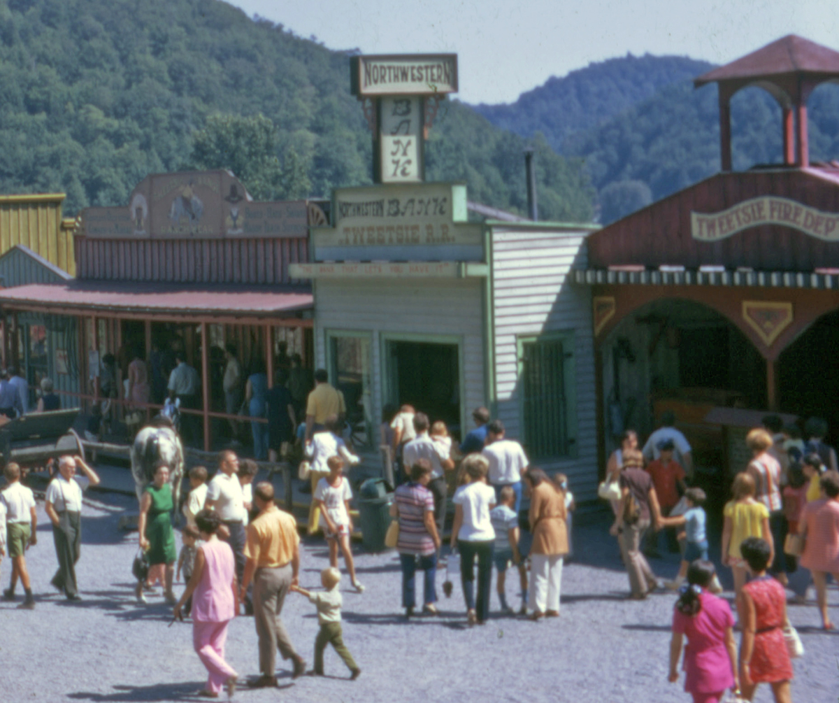 Tweetsie Railroad Main Street including “fire department” building circa September 1971, Harlan Ledford, “Tweetsie Railroad Main Street,” Digital Watauga, accessed February 4, 2026, https://digitalwatauga.org/items/show/9348.