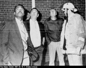 Burke County Rescue Squad members patrolled the perimeter and prevented “reporters, photographers and onlookers” from getting too close to the fire building. Several hundred spectators gathered “in a 500-yard radius” from the fire building.