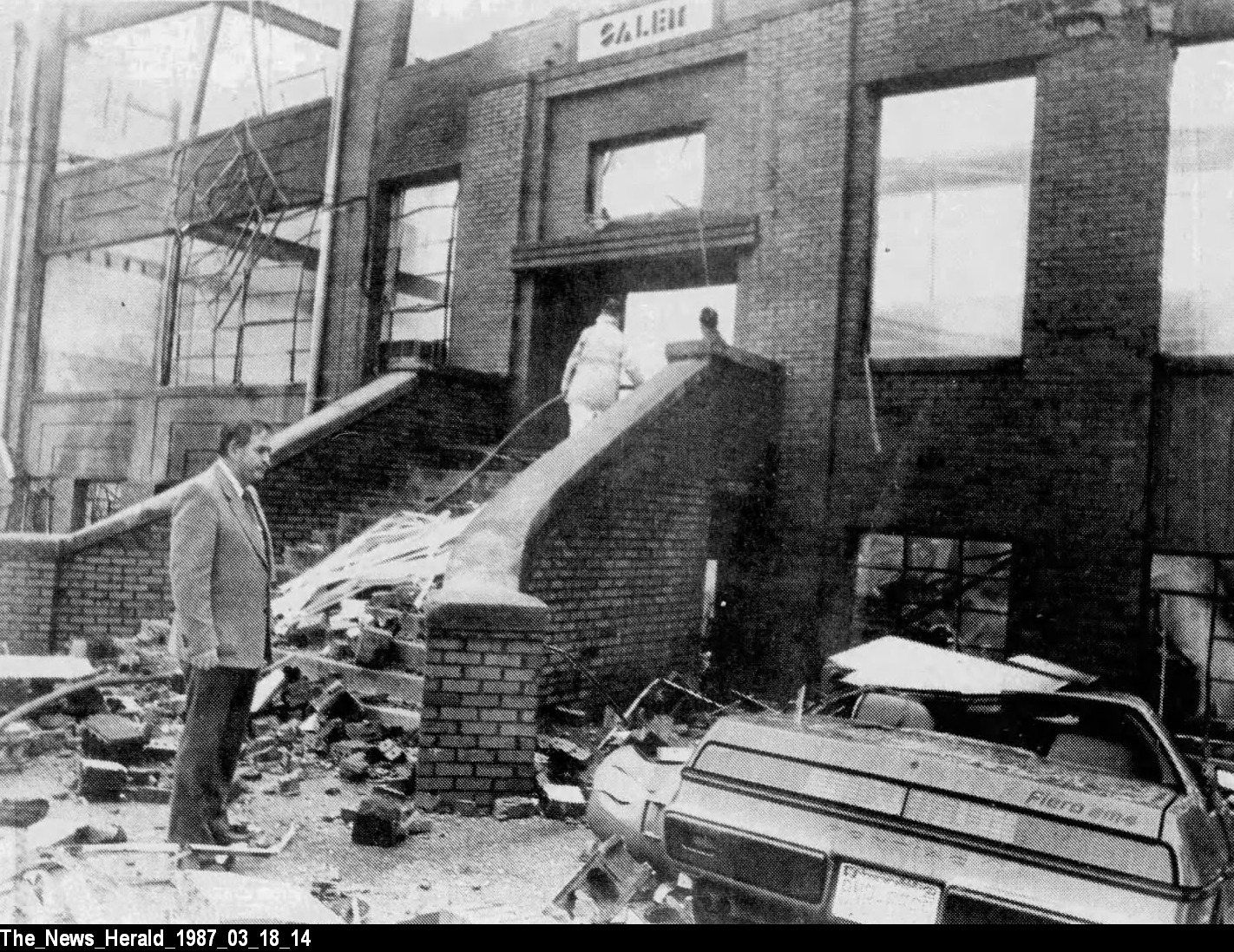 The blast blew out the front windows of the Salem Elementary School, which was located 75 feet away. It also destroyed five automobiles parked next to the junior high school. The damage included a six-inch “piece of metal window frame” that punctured the trunk of a Pontiac Fiero. Falling concrete blocks crushed the fronts of vehicles.