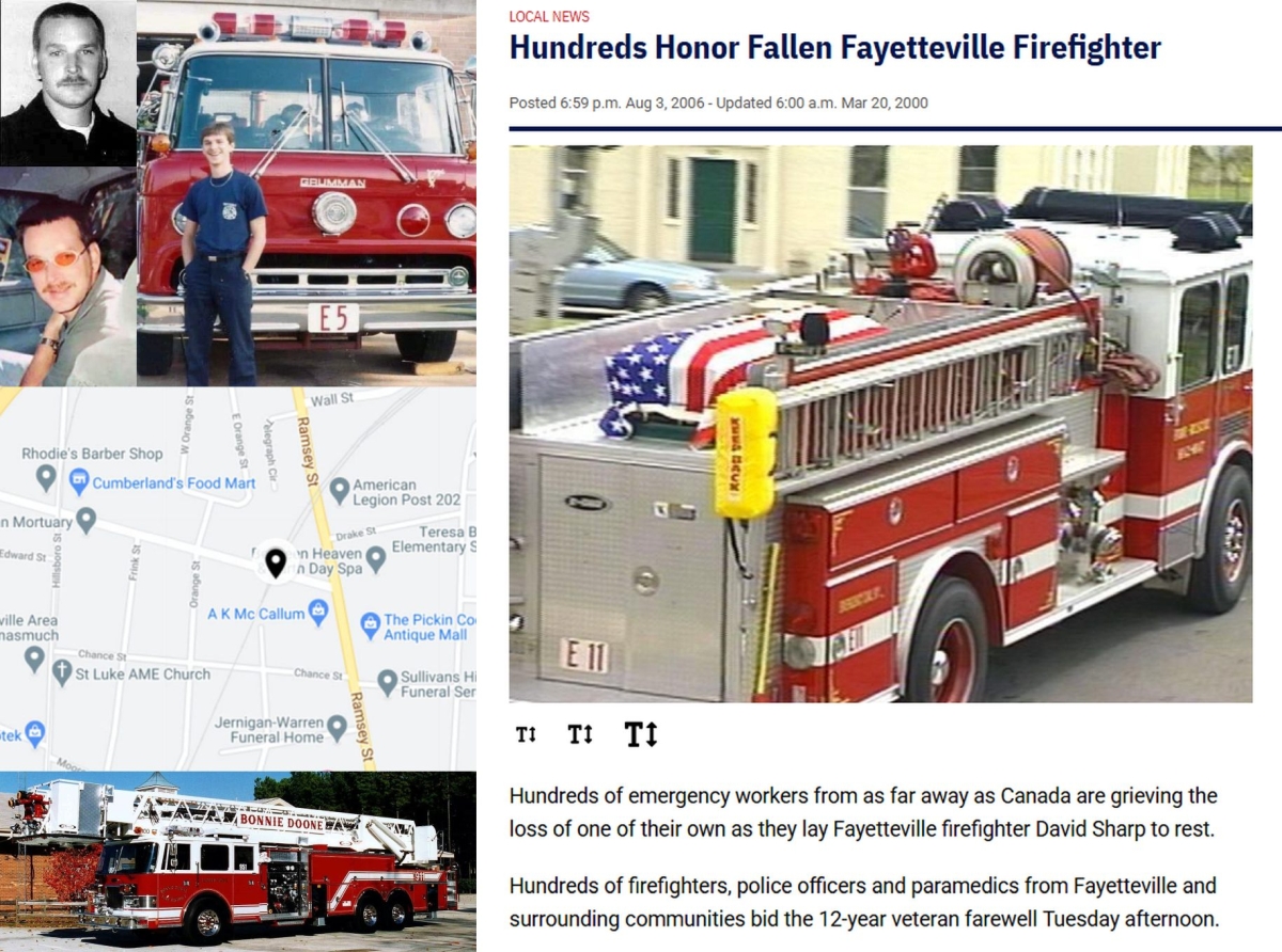 Sharp, 31, was a twelve-year veteran of the Fayetteville FD. His surviving wife was pregnant with their first child. His obituary text is below.