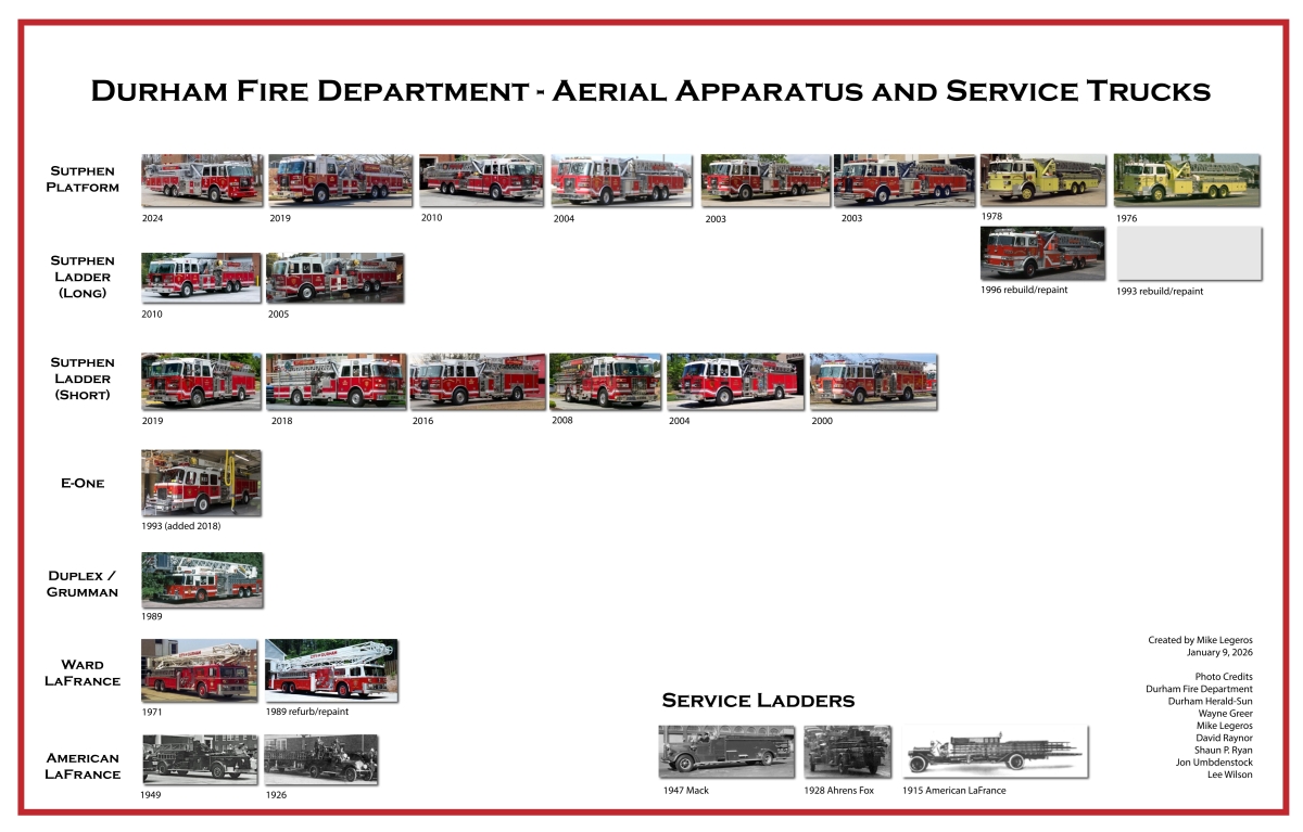 Visual History of Durham Ladder Trucks Posted by Mike Legeros on 9 January 2026, 9:32 pm Share on FacebookShare on TwitterShare on LinkedinShare on Pinterest Presenting a visual apparatus history of Durham Fire Department aerial apparatus and service trucks. See JPG | PDF Facebook Comments Share0Share0Share0