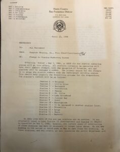 Effective Monday, May 5, 1986, at 0800 the new station numbering system will go into effect. All stations currently in operation will have their numbers changed, with the exception of Socastee, and new stations will be assigned a number. The primary reason for the changes is to align the station numbers with the radio/pager encoding system. This should help simplify the dispatching process for the dispatchers. The station’s numbers will be as follows: