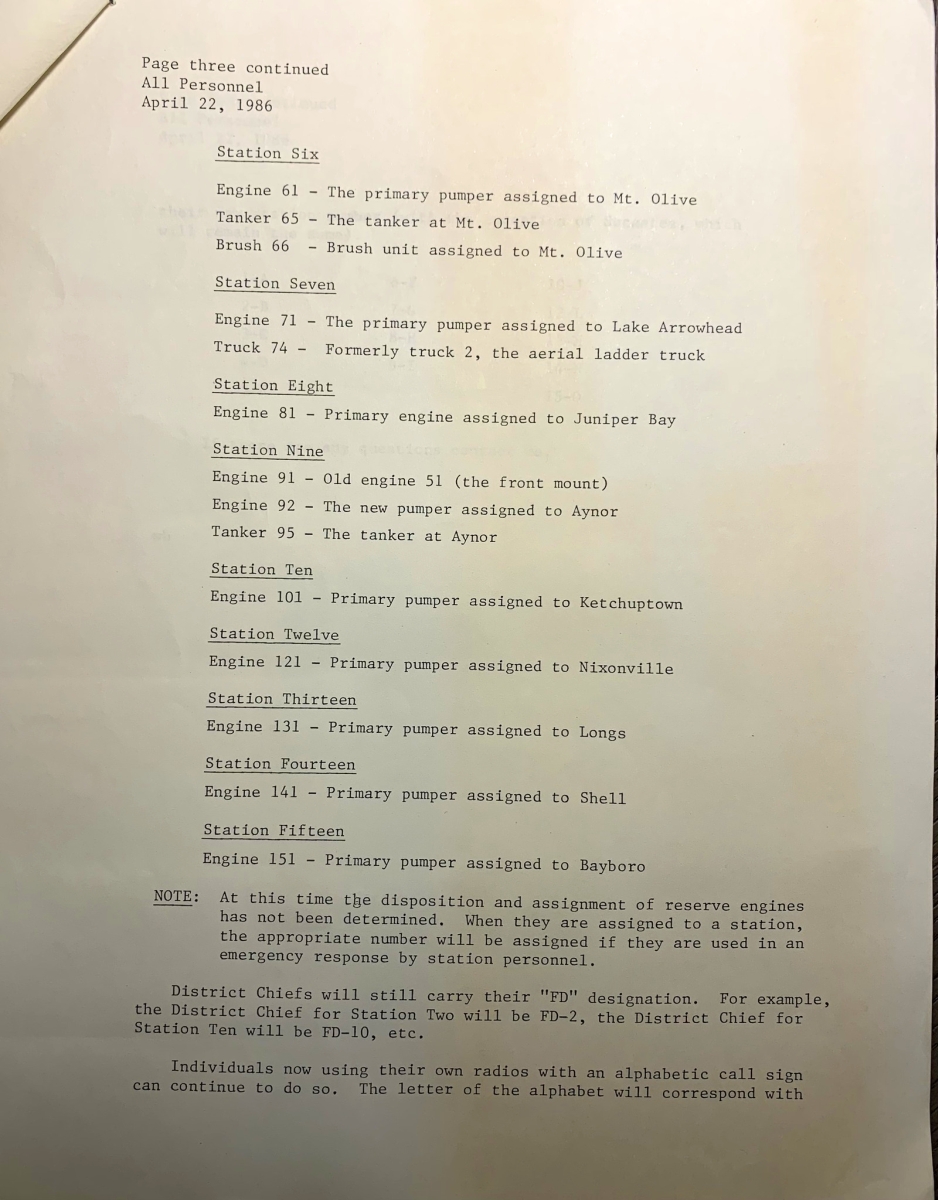 From South Carolina, memorandum of changes to Horry County fire stations and fire apparatus numbers, dated April 22, 1986. Original images at bottom. Here’s a transcription from ChatGPT: