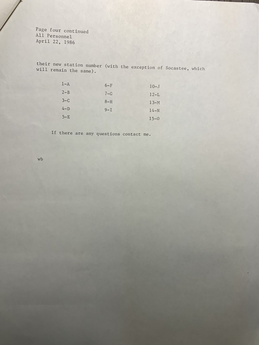 Effective Monday, May 5, 1986, at 0800 the new station numbering system will go into effect. All stations currently in operation will have their numbers changed, with the exception of Socastee, and new stations will be assigned a number. The primary reason for the changes is to align the station numbers with the radio/pager encoding system. This should help simplify the dispatching process for the dispatchers. The station’s numbers will be as follows:
