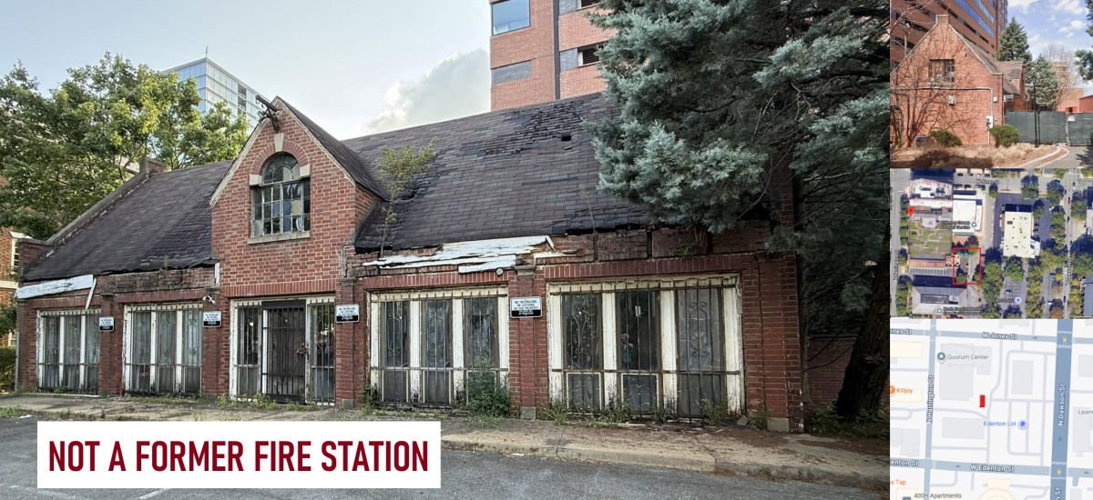 Not an old engine house. Located behind the Quorum Center on West Jones Street, this old building in downtown Raleigh is not a former fire station. However, that’s the story that some Raleigh-ites have heard over the years and decades.