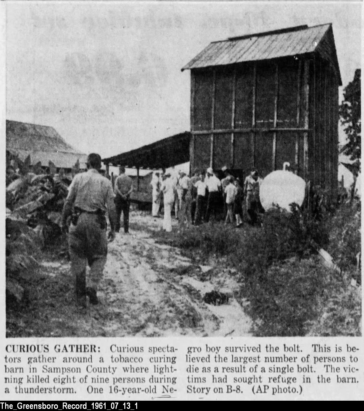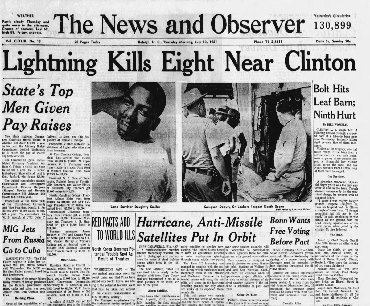 Transcription of News and Observer story about eight people killed by lightning on July 12, 1961, in Sampson County, NC. Plus news photo from the Greensboro Record.