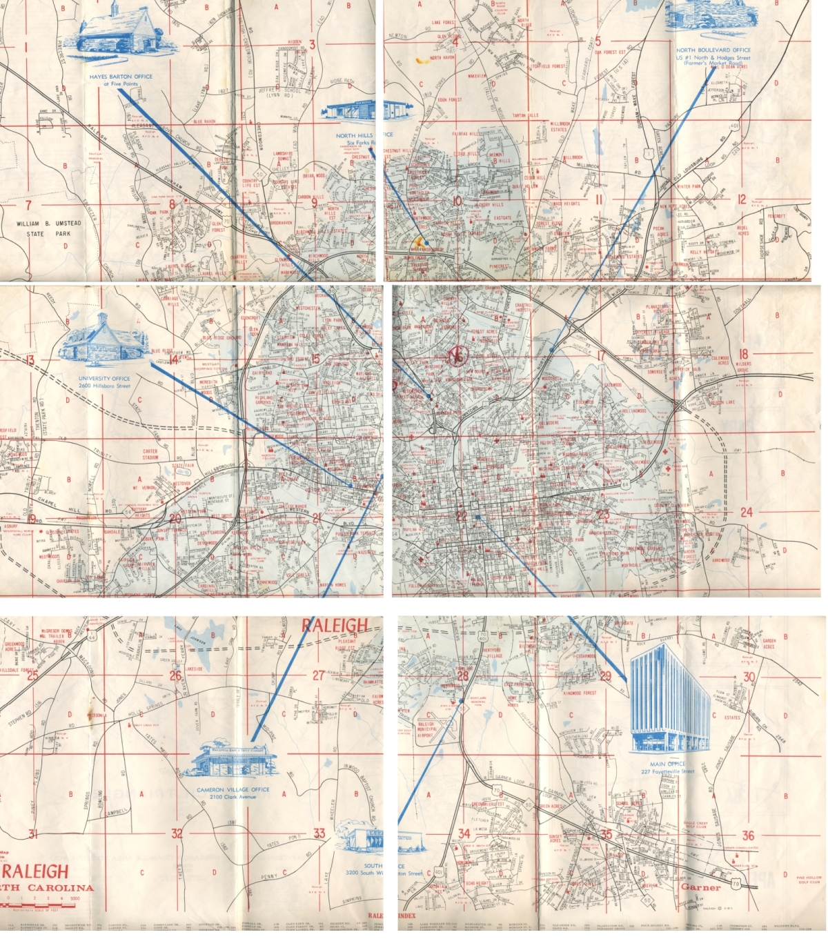 From our archives, incomplete parts of a vintage Raleigh street map, circa 1960s.