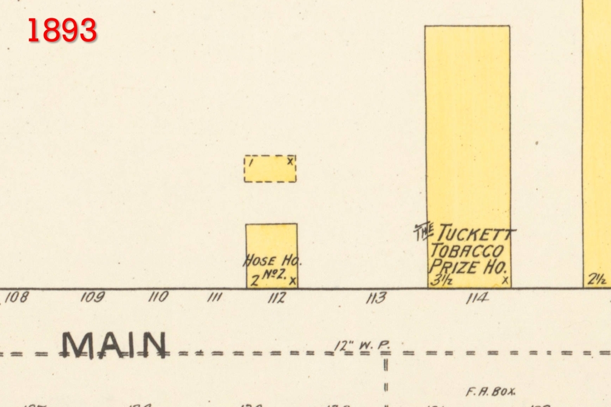 The original Station 2 was located on the north side of W. Main Street, across from the W. Duke & Sons cigarette factory. Research notes:
